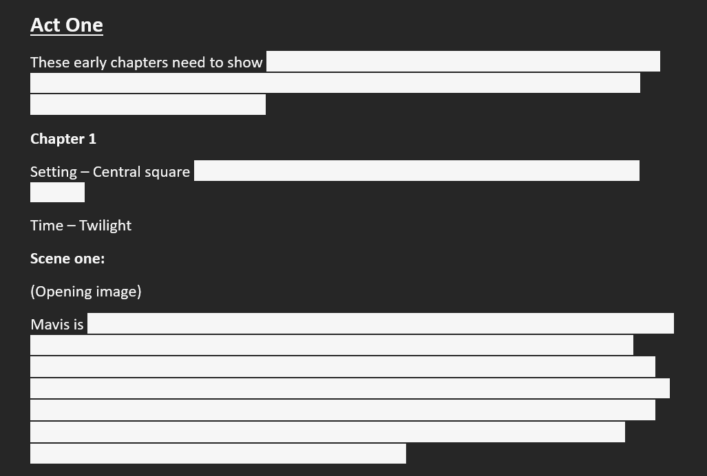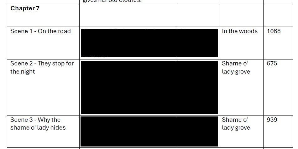 I copied and pasted the information into a Word doc because something in my soul hates seeing things in Excel. I used the three-act structure and the Save the Cat beats to organise my chapters and scenes in a more fleshed-out outline.